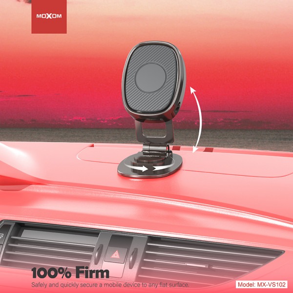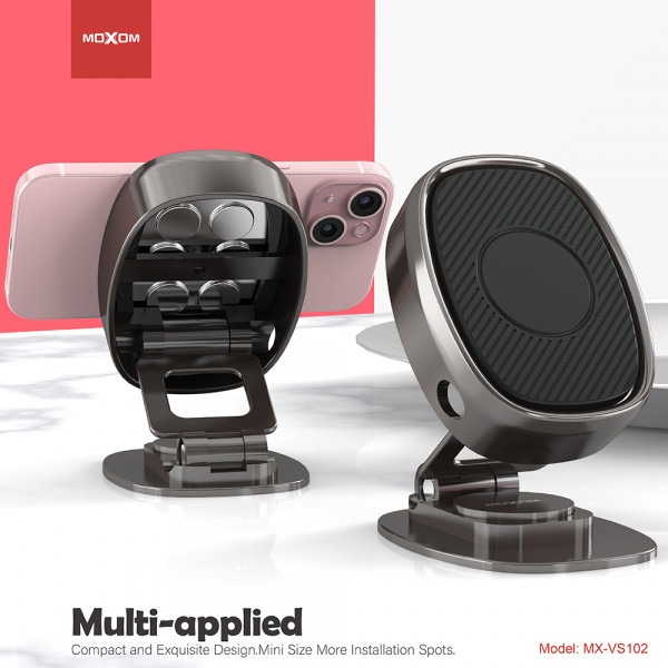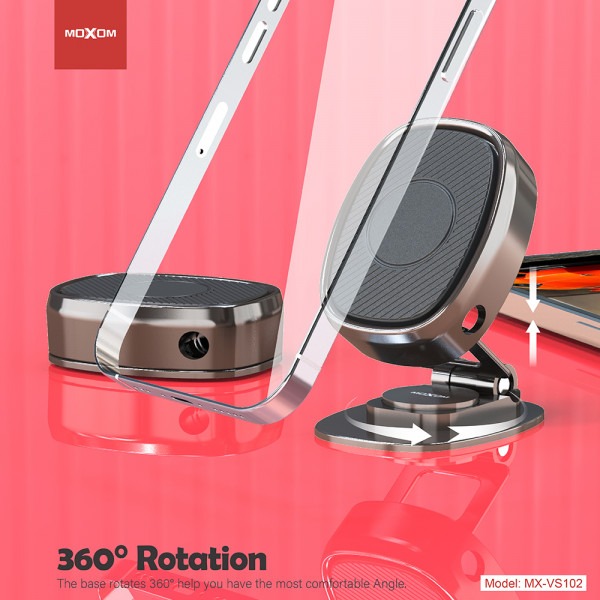 Moxom MX-VS102 është një mbajtëse telefoni kompakte, magnetike, e bërë nga një aliazh zinku i qëndrueshëm. Ajo ka një lidhje të fuqishme magnetike dhe një nyje rrotullimi 360 gradë, duke ofruar montim të gjithanshëm dhe të sigurt për telefonat inteligjentë në një mjedis makine, shtëpie ose zyre.