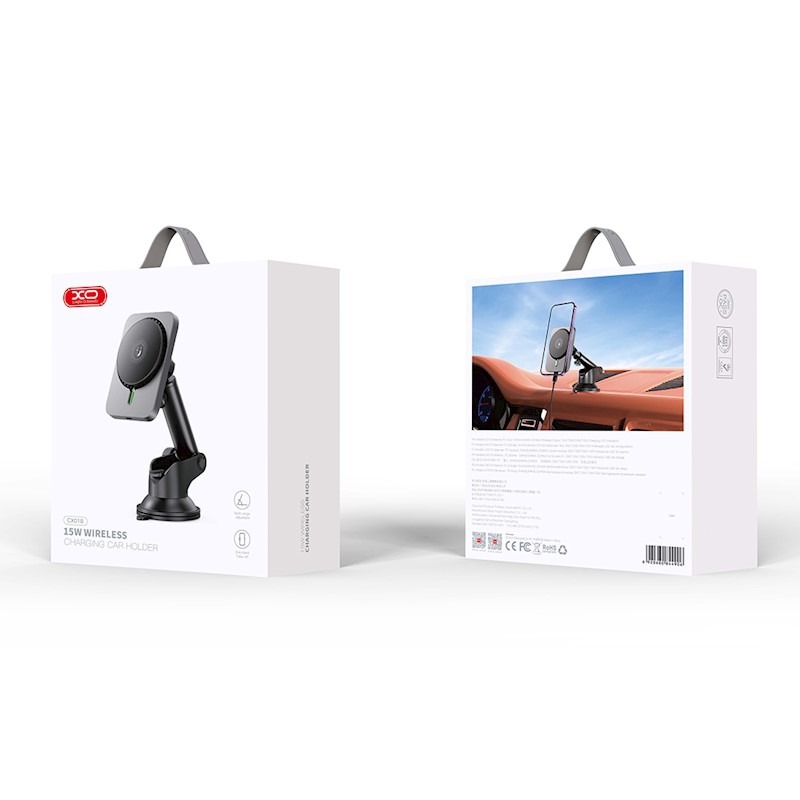 XO-CX018 është një mbajtëse magnetike shumëfunksionale për makinën që kombinon montimin e sigurt të panelit të kontrollit/xhamit të përparmë nëpërmjet një gote thithëse të fortë me karikim të shpejtë pa tel të integruar 15W. Përdor magnete të fuqishëm N52 për fiksim të shpejtë dhe ka rregullueshmëri të gjerë, duke përfshirë rrotullimin 360 gradë dhe një krah teleskopik për pozicionim optimal.
